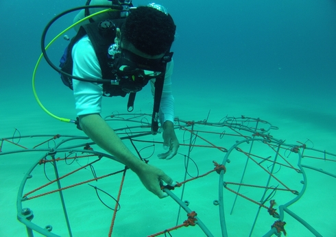 Ya instaló en alta mar, con su equipo de 15 voluntarios, 10 viveros de retoños de coral que serán trasplantados (en 18 meses) al arrecife. ¡Un verdadero vivero de coral! El coral utilizado es un Acropora Cerviconis, recomendado por todas las organizaciones internacionales por su fuerza y crecimiento de 8 a 15cm por año. Los retoños son estibados en estructuras metálicas horizontales en los fondos marinos, especialmente diseñadas en forma de animales marinos tales como estrella del mar, tiburón martillo, manta raya, tortuga y por supuesto en cola de ballena. Una atracción extra cuando el paseo submarino alrededor de los viveros sea autorizado.